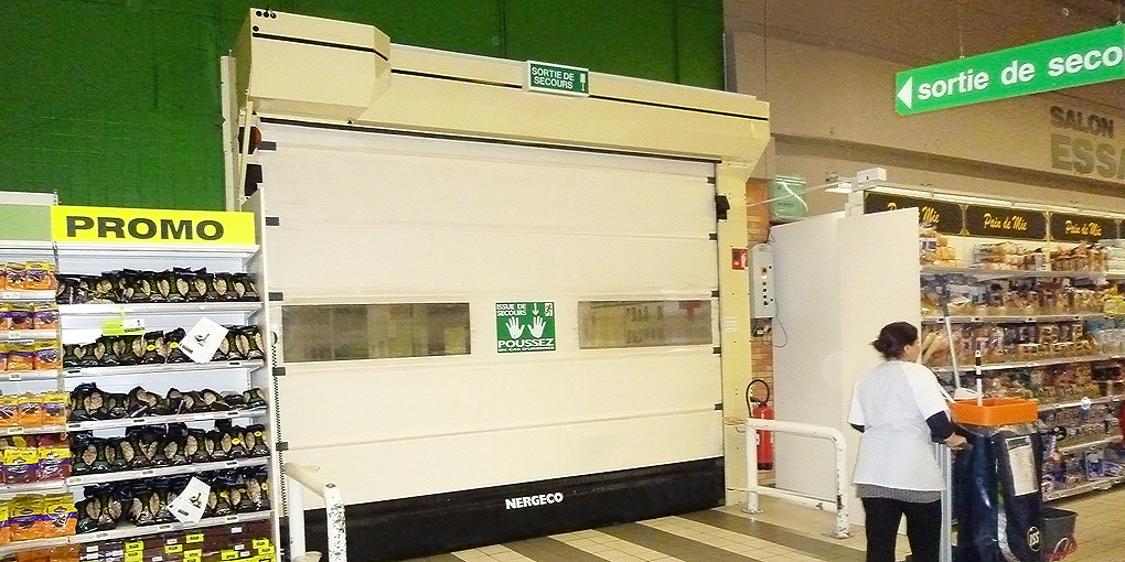 La porte automatique Star 2 Forum (RR 2000 Star) Issue de Secours ajoute aux caractéristiques communes à toutes les portes rapides RR 2000 Star une nouvelle fonction pour les cas d’urgence : sur simple pression de la main sur l'écran souple ou en cas de coupure volontaire ou non d'alimentation électrique, ou en cas de défaillance de l’un des organes de sécurité, la porte s'ouvre automatiquement , libérant l'accès aux couloirs de dégagement vers les issues de secours réglementaires. Elle a reçu l'homologation CO 48 de la Commission Centrale de Sécurité . Jusqu'à 4 x 4 m.